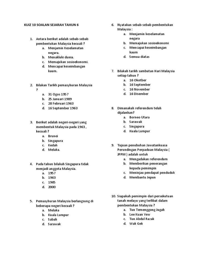 (c) (i) kemerdekaan negara pada 31 ogos 1957 telah dicapai tanpa pertumpahan darah buktikan kebenaran pernyataan tersebut [6 . Contoh 2 sains kertas 1 contoh 1 contoh 2 contoh 3. Koleksi soalan latihan nota modul sejarah tahun 6 upsr jawapan 1. Himpunan set soalan pbd bagi peperiksaan pertengahan tahun (ppt) sesi 2022 bagi darjah 1 hingga 6 termasuk set lengkap upkk. Latihan kompetitif dijalankan secara berkumpulan atau individu. Pelajar dan guru dapat memanfaatkan penggunaan ict bagi memberikan .